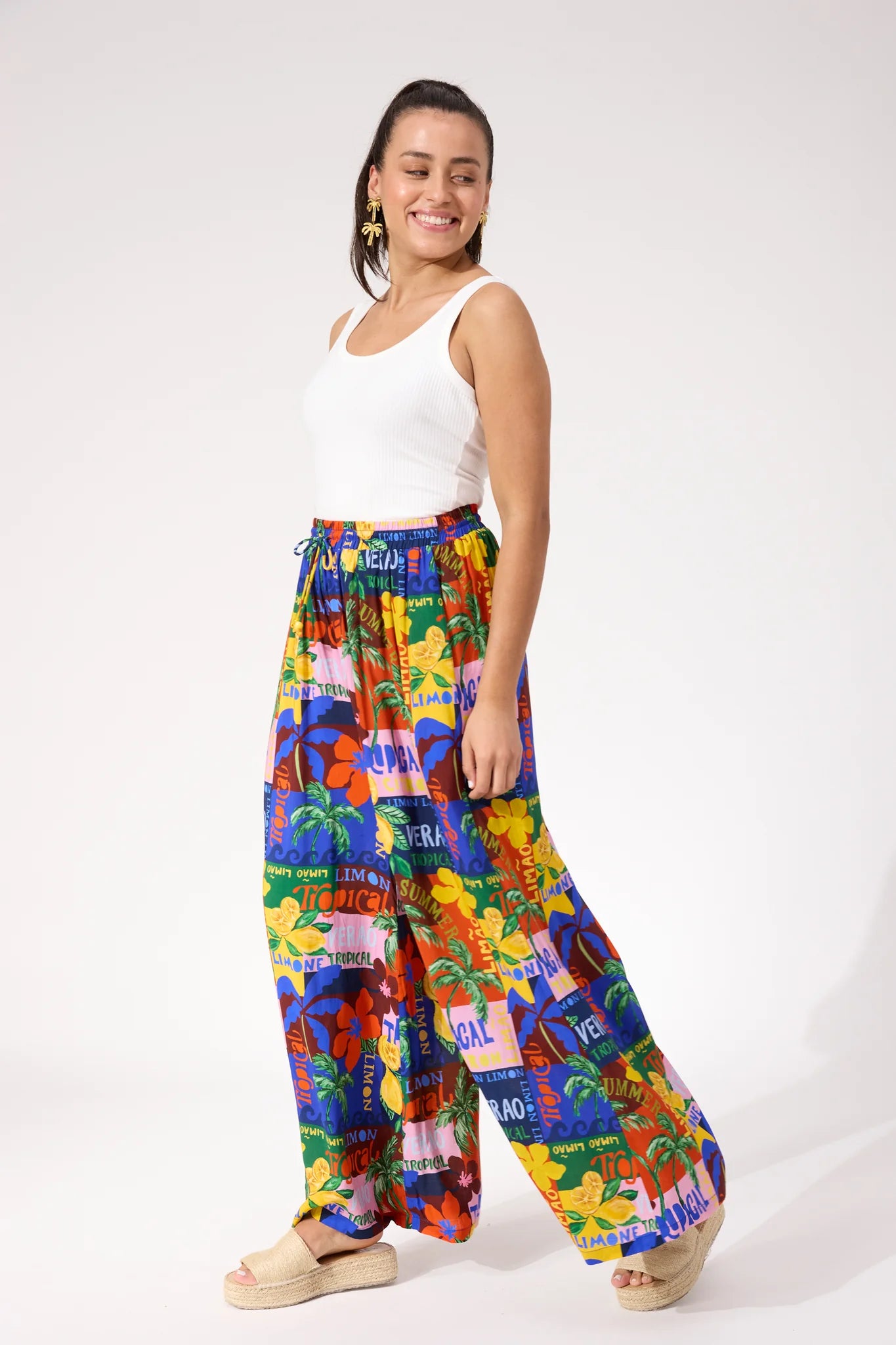 Designed for movement and comfort, the Odyssey Palazzo Pant showcases a bold tropical print and fluid wide-leg silhouette that brings instant summer energy. Crafted in a soft, lightweight fabrication, it features an encased tie waistband with yellow bead detailing and internal side pockets for everyday practicality.