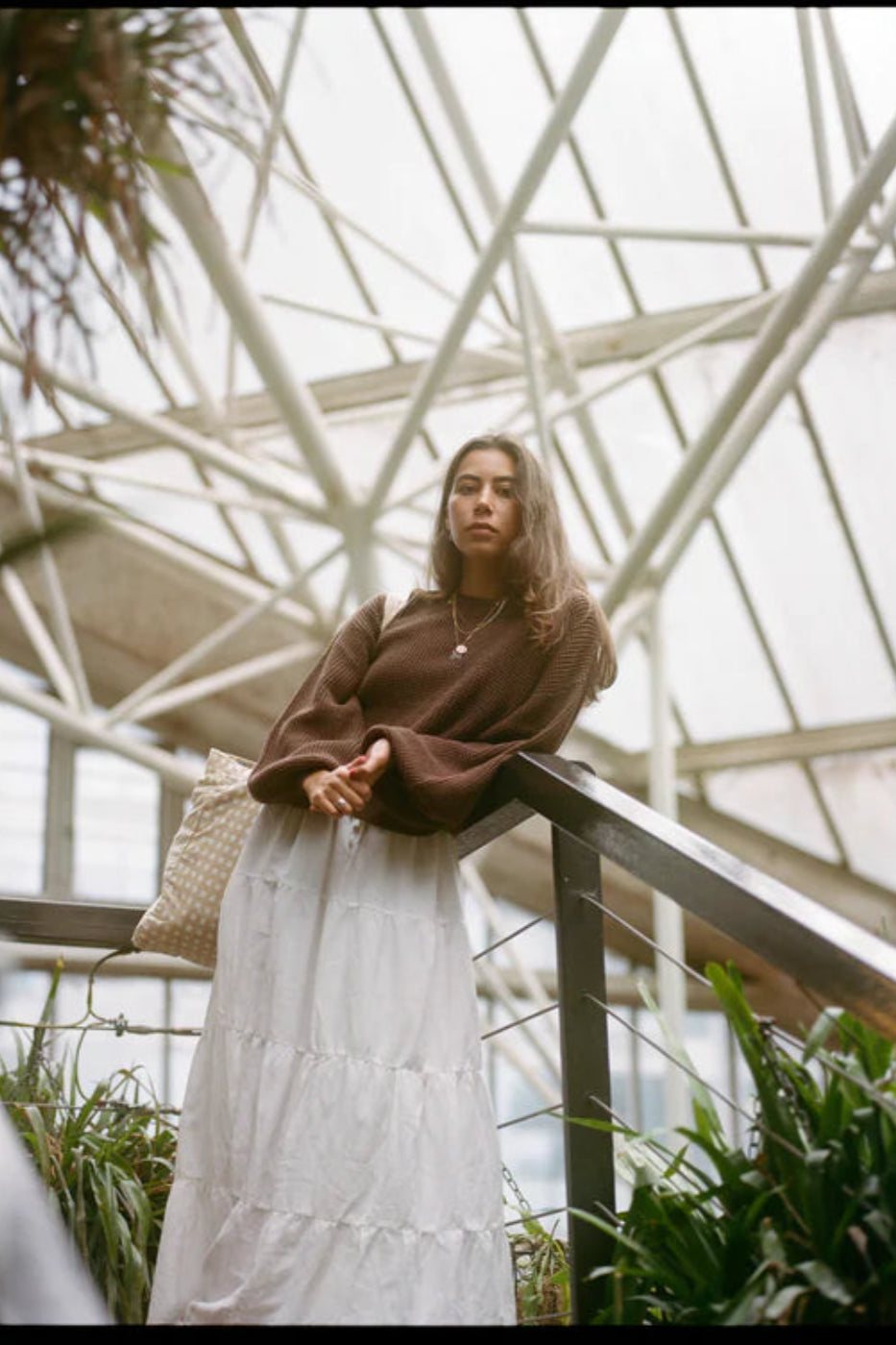 A beige knit sweater worn over a white skirt by a woman, with her arms at her sides and a neutral expression on her face.