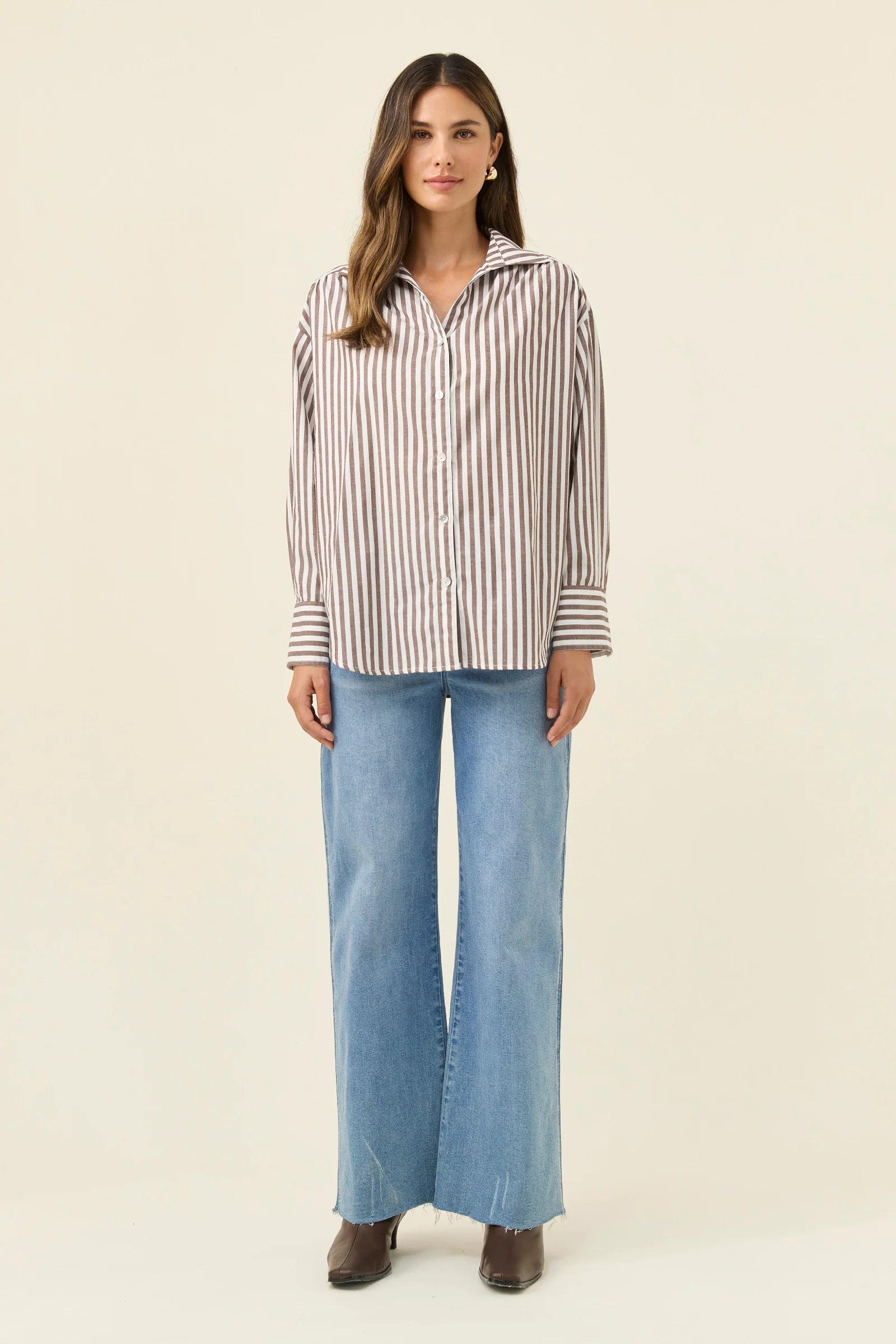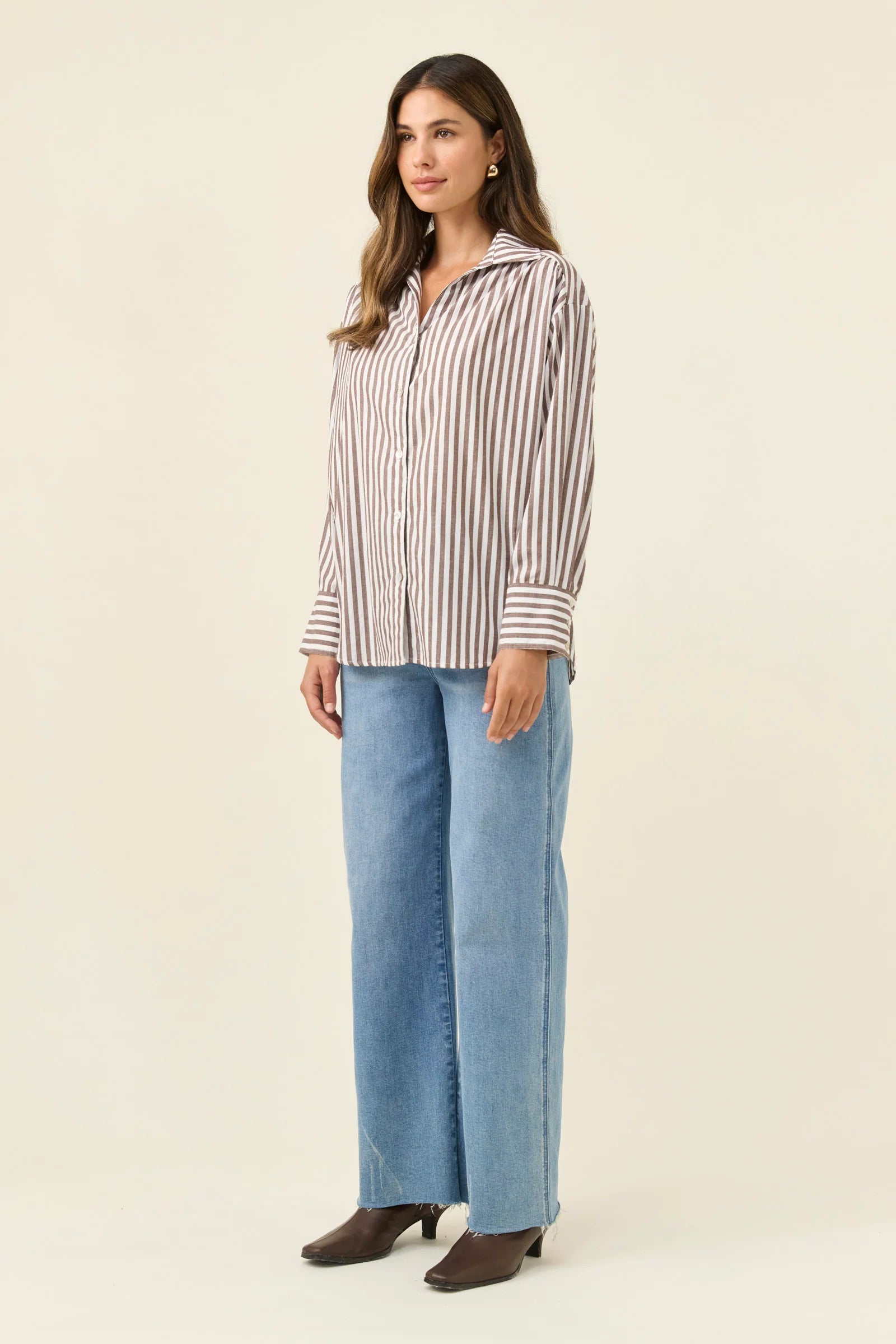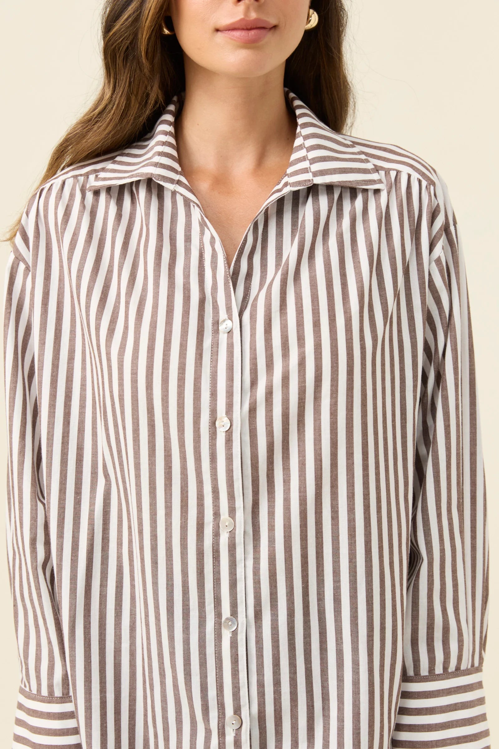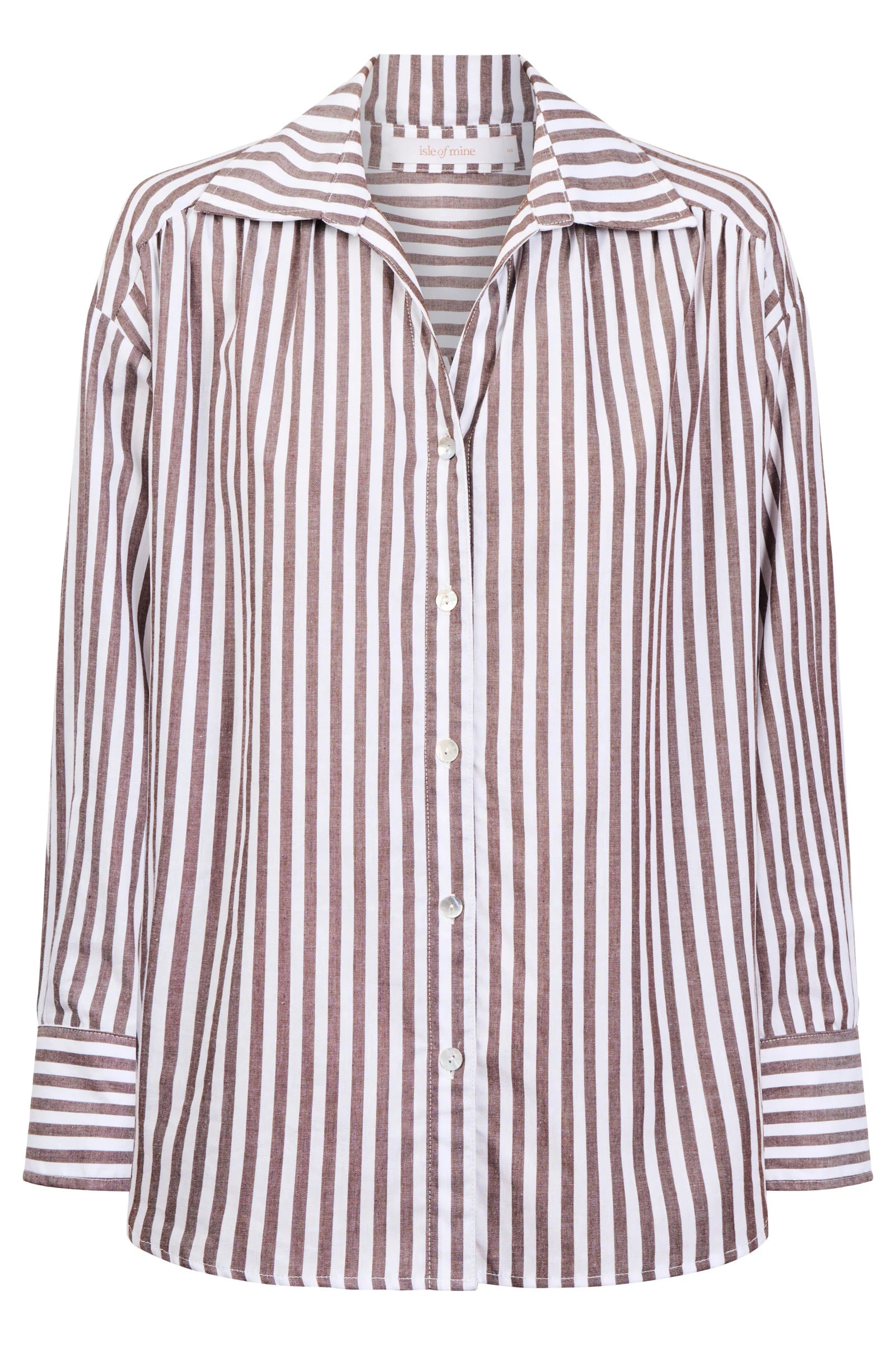 A cotton shirt with soft structure and subtle details, including a dropped collar and yarn-dyed stripe pattern. The gathered front and back yoke add fluidity, while the three-button cuffs feature contrast-direction stripes for a considered finish.
