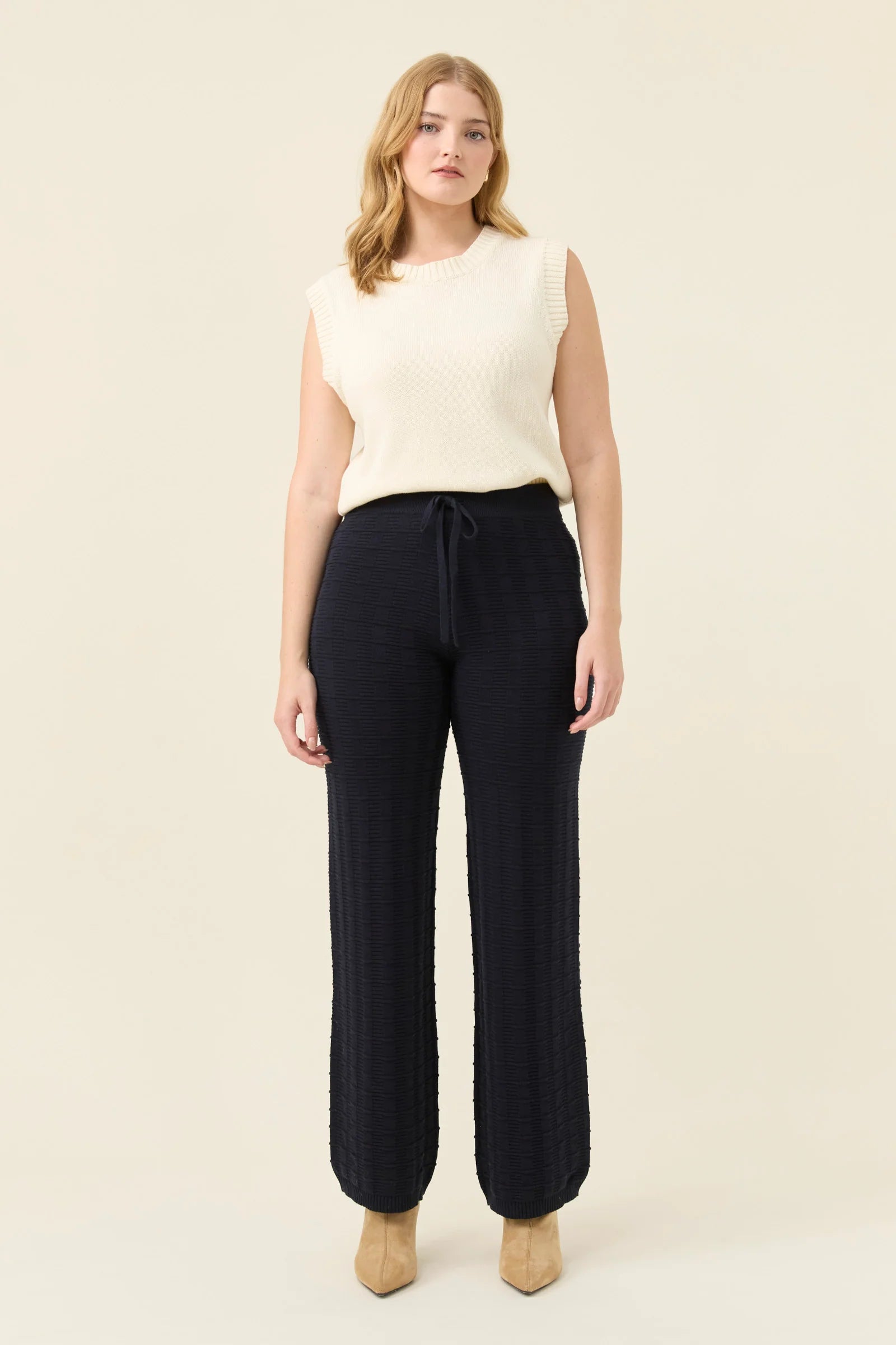 A comfortable full-length knit pant crafted from textured cotton with a soft drape. The elasticated waistband with drawstring offers an adjustable fit, making it a natural choice for quiet days and easy layering.