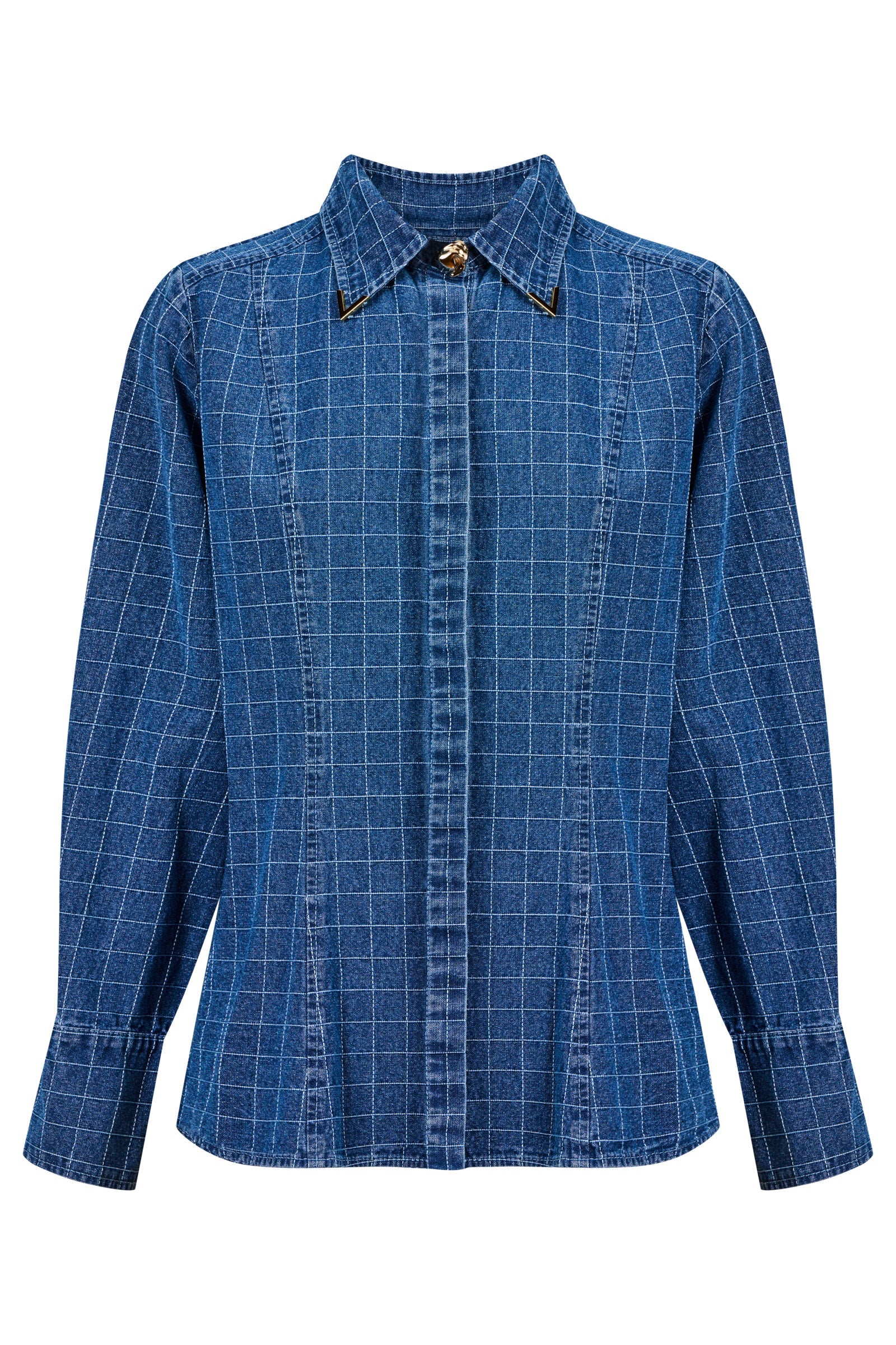 A textural denim shirt with a subtle check pattern that gives it a warm, vintage feel. The hidden placket keeps the front clean, while the gold-tipped collar trim and statement buttons add a touch of polish. Shaped panels through the body create gentle structure without feeling rigid.