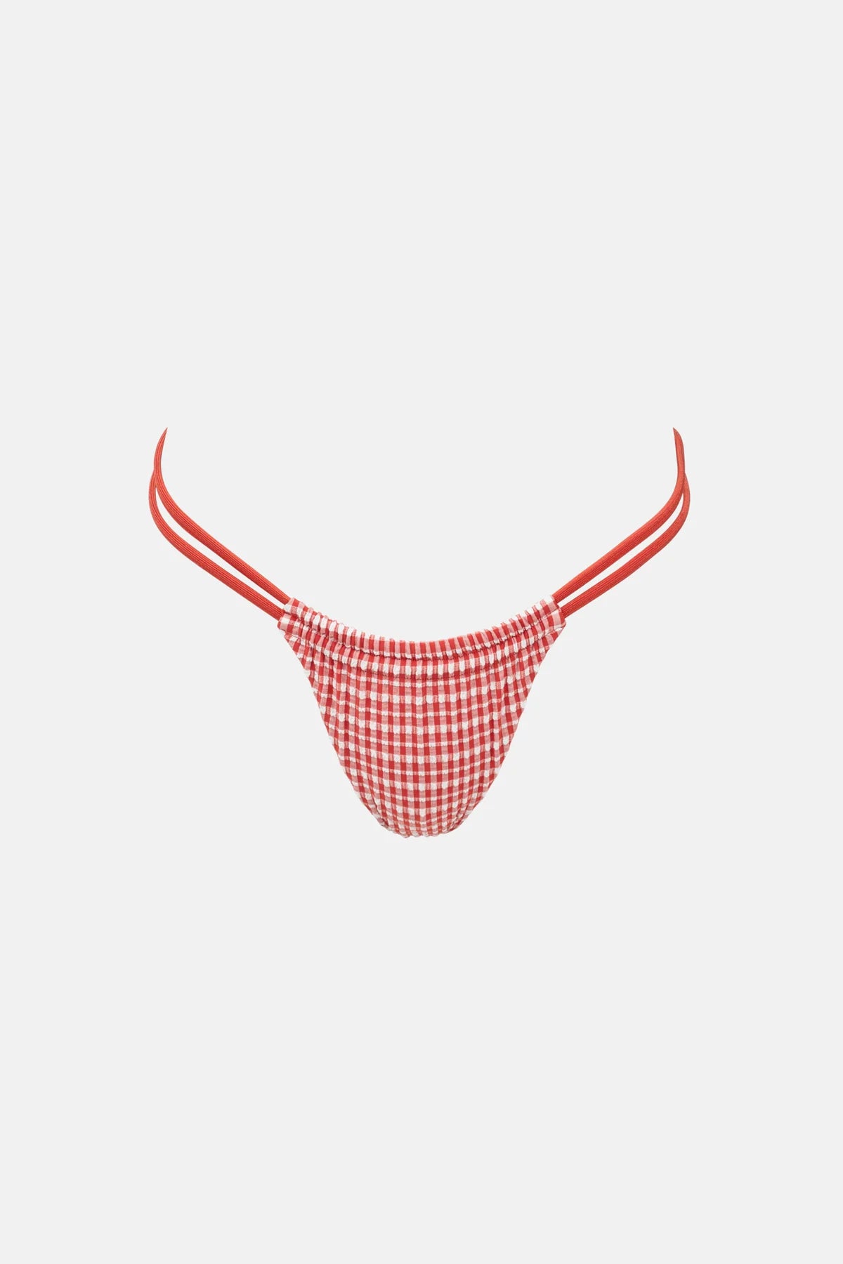 In Fire, the Lola Check Double Strap Itsy Pant offers minimal coverage with double strap details in contrast soft rib fabric, designed to be worn high on the hips. The functional front and back gather allows for a customized fit, finished with clean-finished edges and a metal coin logo.
